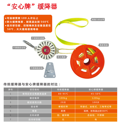 逃生緩降器/救生器主要用于火災時外部救援無法到達或者不能及時到達情況下的高樓逃生救援。它具有使人體從高處沿繩索安全至地面的功能。充分考慮到火災時逃生時間緊,逃生空間小,逃生處環境復雜,可能無幫手等特點。體積小,便攜帶,不用電,不借助外力,僅靠人體自重就可工作,完全可以一人快速自救逃生,并可實現勻速下落或者懸停的裝置。