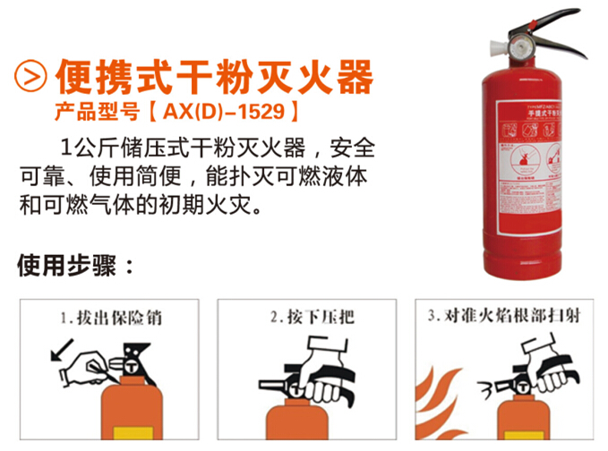 1、滅火器。簡易式干粉滅火器,能撲滅普通的固體材料火、可燃液體和氣體的初期火災,用于家庭初期火災的控制。