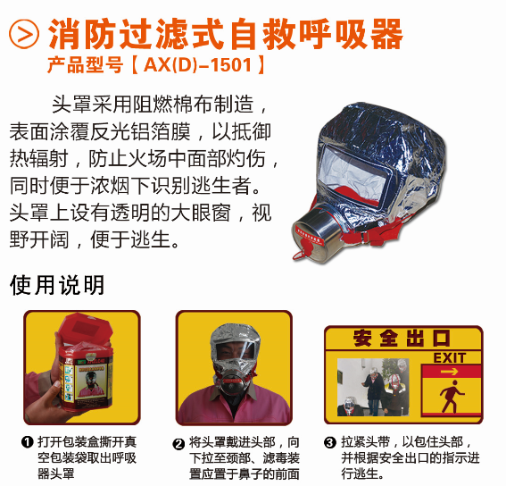 “安心”牌消防過濾式自救呼吸器頭罩采用阻燃棉布制造,表面涂覆反光鋁箔膜,以抵御熱輻射,防止火場(chǎng)中面部灼傷,同時(shí)便于濃煙下識(shí)別逃生者。
