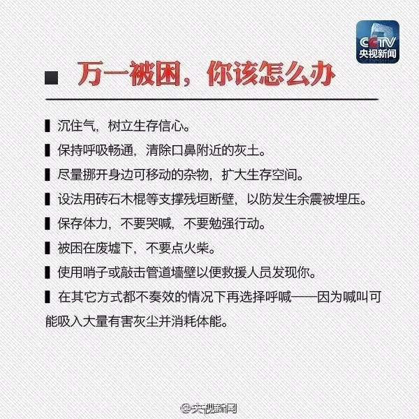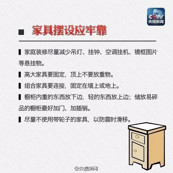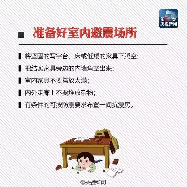 “寧可千日不震,不可一日不防”。災難一旦發生,生死存亡就在瞬息之間。所以,日常生活中應當學習、掌握應急避震知識,準備地震應急包,萬一遭遇強震,就能減少自己和家人的生命危險。
