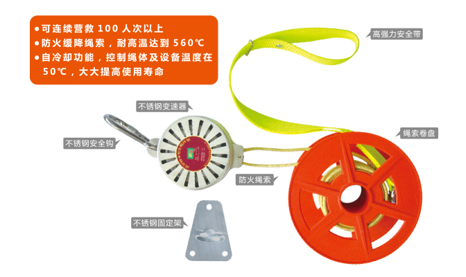 "安心"牌自冷卻高層樓宇救生緩降器擁有3項專利,其獨特的自冷卻功能,杜絕了緩降過程中因高溫造成的卡死現象,緩降繩索具有防火阻燃特性,230攝氏度高溫條件下可長期使用,解決了100米高層火災逃生的問題。