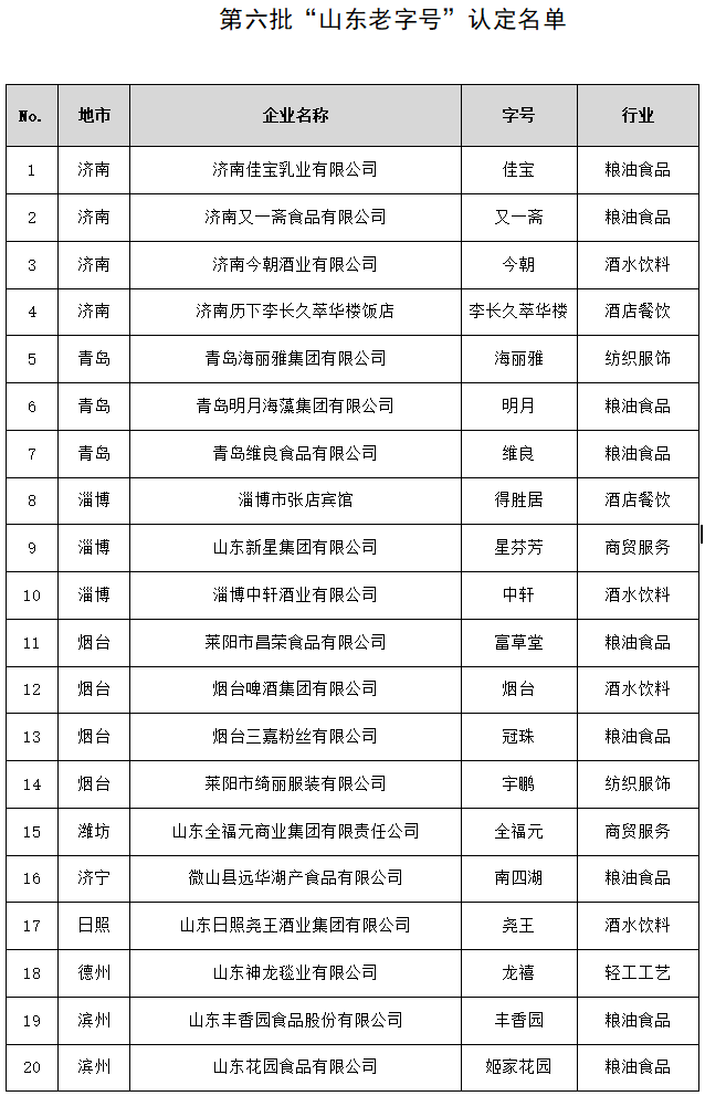 為推動我省老字號創(chuàng)新發(fā)展,培育壯大老字號隊伍,健全我省老字號保護(hù)、傳承、創(chuàng)新、發(fā)展四個體系,根據(jù)《山東老字號認(rèn)定及保護(hù)促進(jìn)辦法》和《山東老字號認(rèn)定通則》,省商務(wù)廳會同省直有關(guān)部門及相關(guān)協(xié)會、專家、企業(yè)代表對各市推薦上報的第六批“山東老字號”申報企業(yè)進(jìn)行了嚴(yán)格評審,并將擬認(rèn)定企業(yè)名單面向社會進(jìn)行公示,公示結(jié)果在規(guī)定時間內(nèi)未收到異議。現(xiàn)認(rèn)定濟(jì)南佳寶乳業(yè)有限公司(注冊商標(biāo):佳寶)等20家企業(yè)為第六批“山東老字號”。