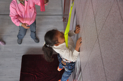家長(zhǎng)陪同孩子一起體驗(yàn)高層樓宇緩降器