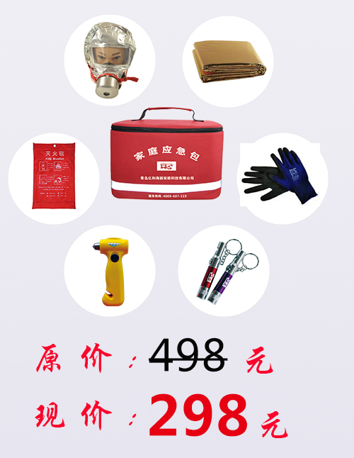 內含“安心”牌過濾式消防自救呼吸器、應急保溫毯、多功能逃生錘、應急口哨、滅火毯、防護手套。
