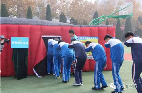 在演練現場,有一個類似于充氣墊的裝備,其一側有兩個門。“這是煙霧逃生通道,模擬著火現場,讓學生體驗。”青島市應急安全教育培訓中心講師介紹。隨后,培訓講師打開門,說明注意事項后,學生排隊進入。“參加演練的學生進入煙道逃生體驗系統后,要判定險情并自行選擇通行路徑和保持正確的姿勢,所有人應在規定的時間內走完全程。”負責演練的講師說。