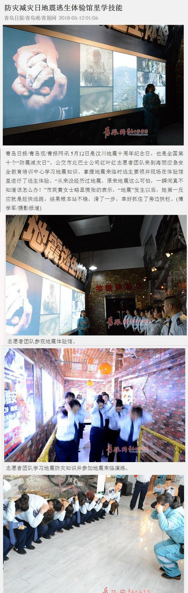 5月12日是汶川地震十周年紀(jì)念日,也是全國第十個(gè)“防震減災(zāi)日”。公交市北巴士公司紅葉紅志愿者團(tuán)隊(duì)來到海麗應(yīng)急安全教育培訓(xùn)中心學(xué)習(xí)地震知識、掌握地震來臨時(shí)逃生要領(lǐng)并現(xiàn)場在體驗(yàn)館里進(jìn)行了逃生體驗(yàn)。“從來沒經(jīng)歷過地震,原來地震這么可怕,一瞬間真不知道該怎么辦!”市民黃女士略顯慌張的表示,“地震”發(fā)生以后,她第一反應(yīng)就是趕快逃跑,結(jié)果根本站不穩(wěn),滑了一步,幸好抓住了旁邊扶欄。
