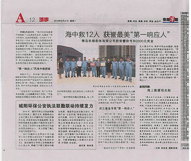 《青島早報》:海中救12人,獲譽(yù)最美第一響應(yīng)人