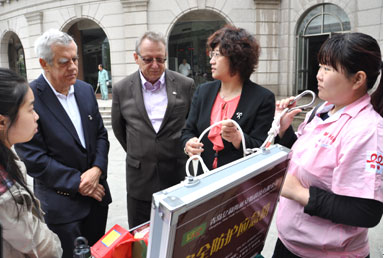 公司董事長向國際紅十字會瑞典籍專家介紹產品