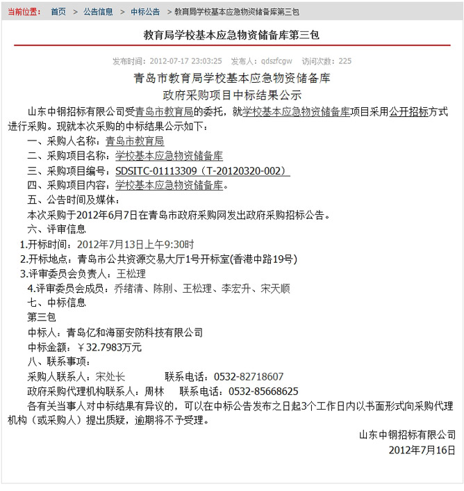 青島市教育局學校基本應急物資儲備庫政府采購項目