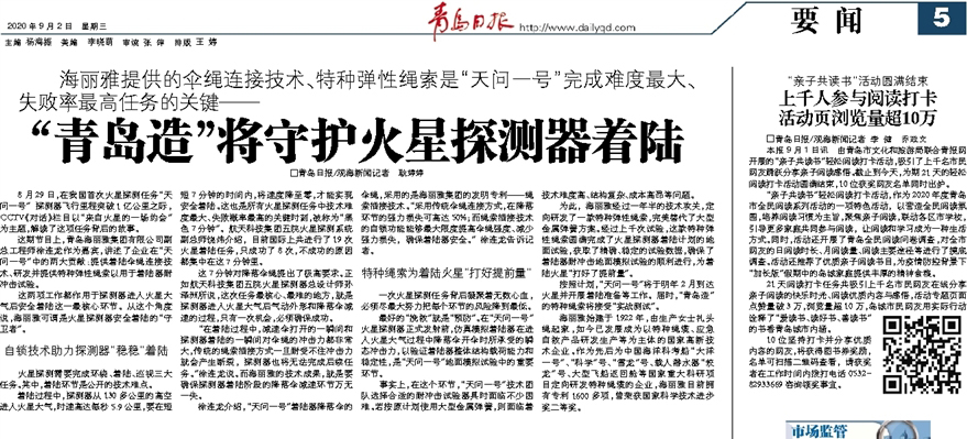 按照計(jì)劃,“天問一號”將于明年2月到達(dá)火星并開展著陸準(zhǔn)備等工作。屆時(shí),“青島造”的特種繩索將接受“實(shí)戰(zhàn)測試”。