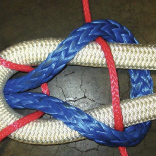 纜繩尾可以使用雙合結(jié)直接連接到高模量合成纖維纜繩上。雙合結(jié)是一種不使用連接裝置而將兩根纖維繩連接起來的方法。使用后的雙合結(jié)可能會(huì)變得非常緊,建議在雙合結(jié)中加入一段繩頭,有助于將纜繩尾和主纜分開,以便進(jìn)行更換或檢查。大多數(shù)繩頭是由直徑較小的傳統(tǒng)纖維繩做的。
