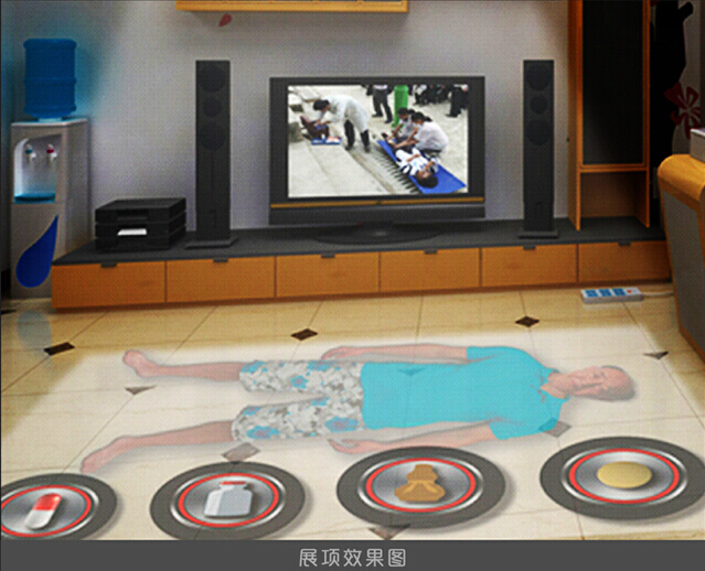 家居消防安全設備展示方式:通過地面投射的方式,展示一個不同程度燒傷的傷員,參觀者通過選擇不同的處理辦法,進行傷員的虛擬救助。
