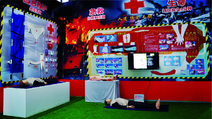 醫療急救體驗館,通過多媒體設備,還原傷者的生命體征狀況,體驗者按照教學步驟對模型實施救護。主要包括心肺復蘇、燒傷斷肢包扎、醫療急救(自救)單品展示及使用、醫療急救小常識講解學習等。讓體驗者了解和認識醫療急救器材及使用方式,學會基礎應急自救。