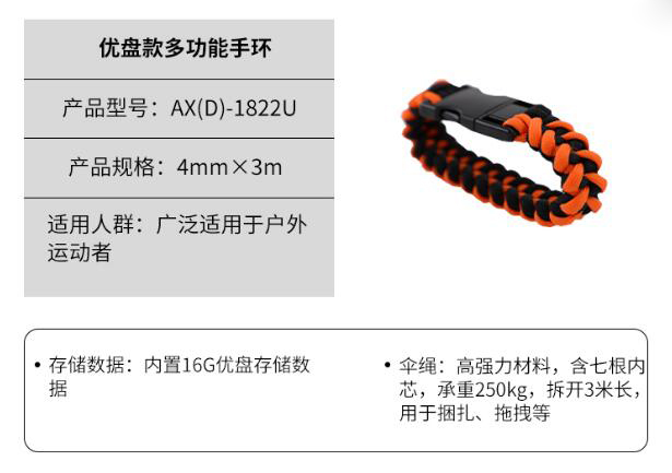 產品展示 當前位置:首頁 > 產品展示 > 戶外用品,防火救生繩及特種繩纜 > 戶外應急必備系列 > 優(yōu)盤款多功能手環(huán)