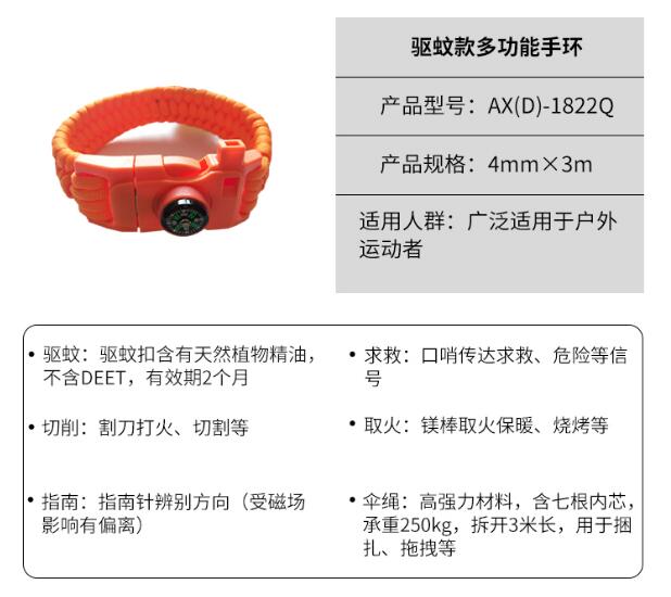 產(chǎn)品展示 當(dāng)前位置:首頁(yè) > 產(chǎn)品展示 > 戶(hù)外用品,防火救生繩及特種繩纜 > 戶(hù)外應(yīng)急必備系列 > 驅(qū)蚊款多功能手環(huán)